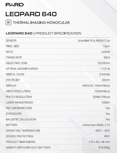Dettagli prodotto Pard LEOPARD 640 Lente 35mm – Monoculare Termico LE6-35/LRF